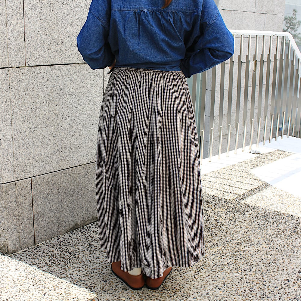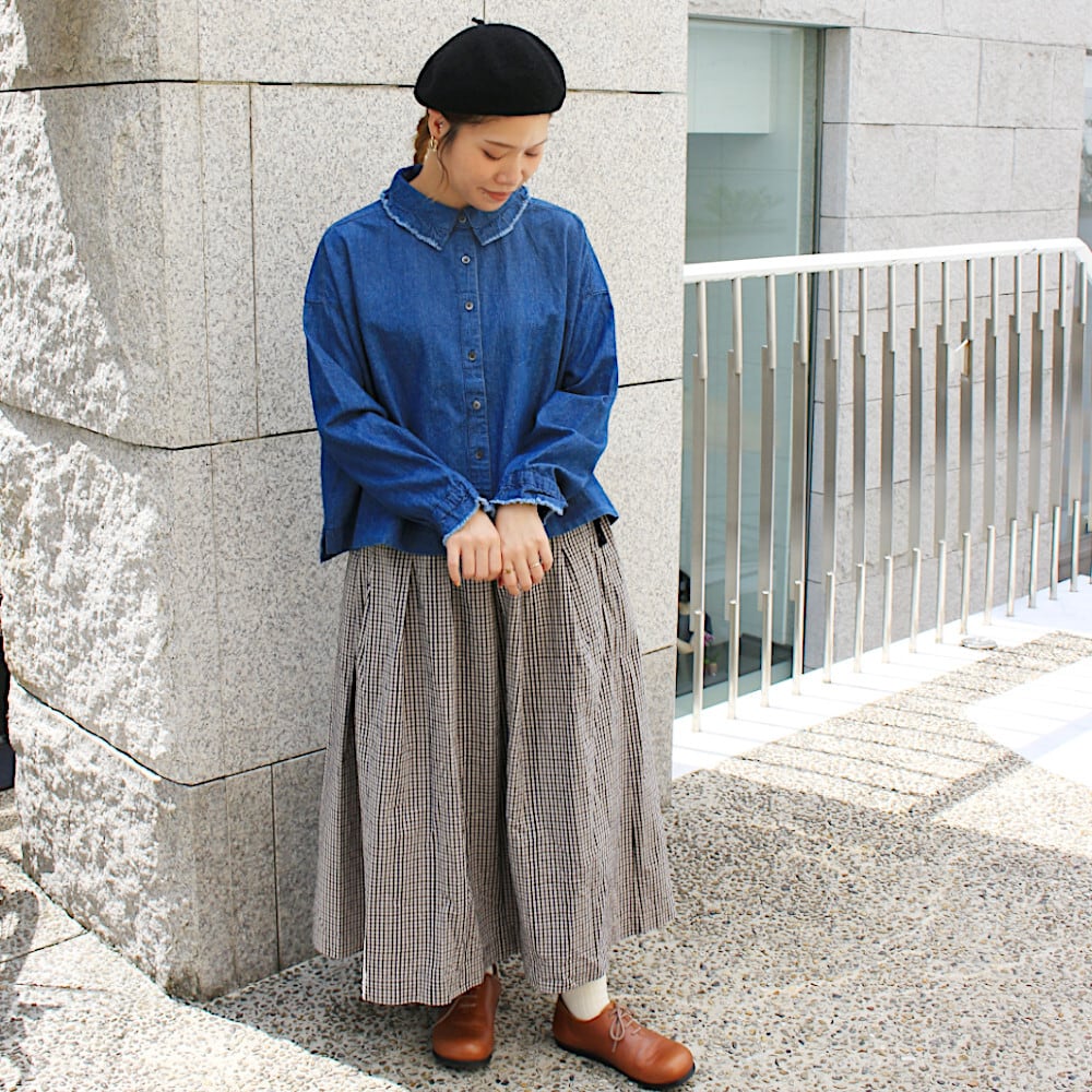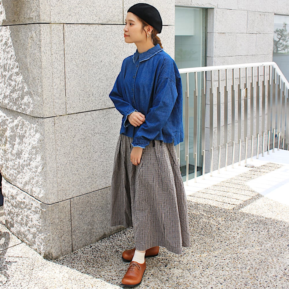 このシルエットが好きな方も多く、柄違い色違いで持ってくださってる方もいらっしゃいます。着丈は少し短めにしているので、ソックスやブーツなどでコーディネートが楽しめます。